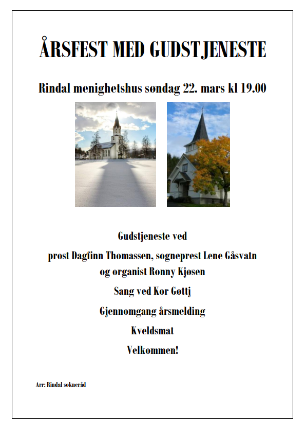 Menighetens årsfest med gudstjeneste blir på Rindal menighetshus søndag 22. mars kl 19.00